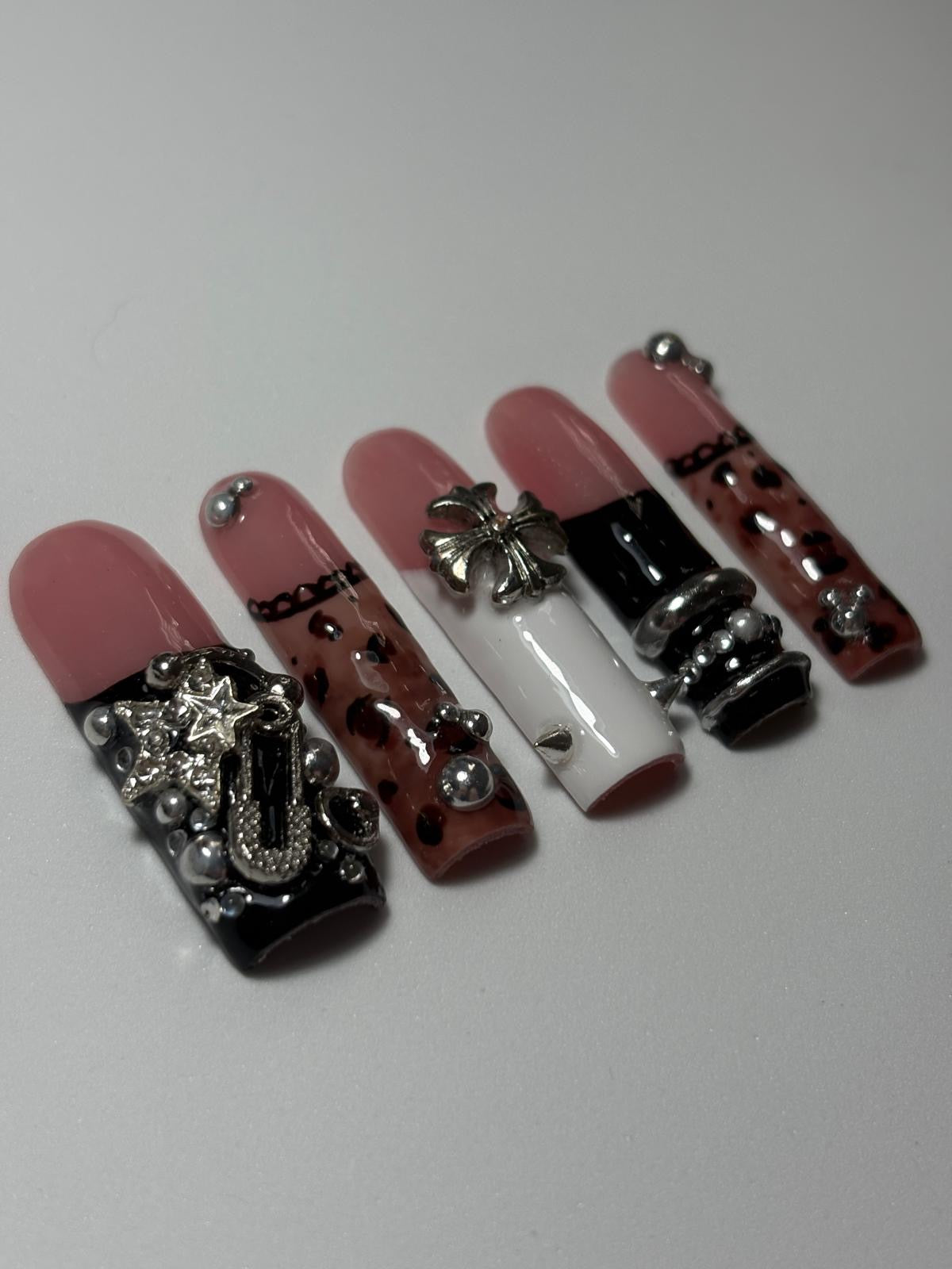 Gothic Glam blends soft pink, black and white tones with chrome accents, spikes and silver charms. A playful yet dark aesthetic inspired by alt fashion and gothic glam. Handmade with salon-grade gel and reusable for multiple wears.
